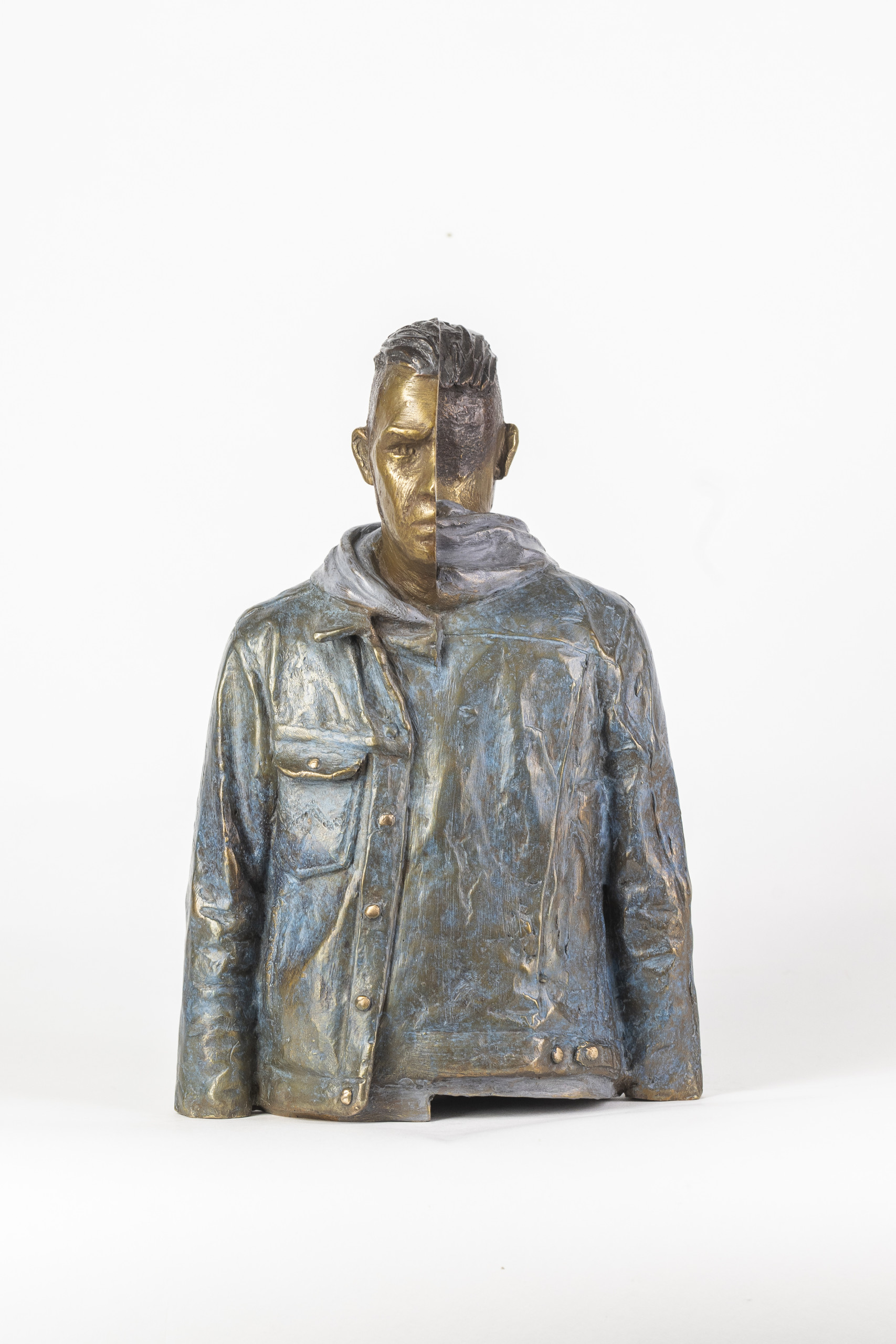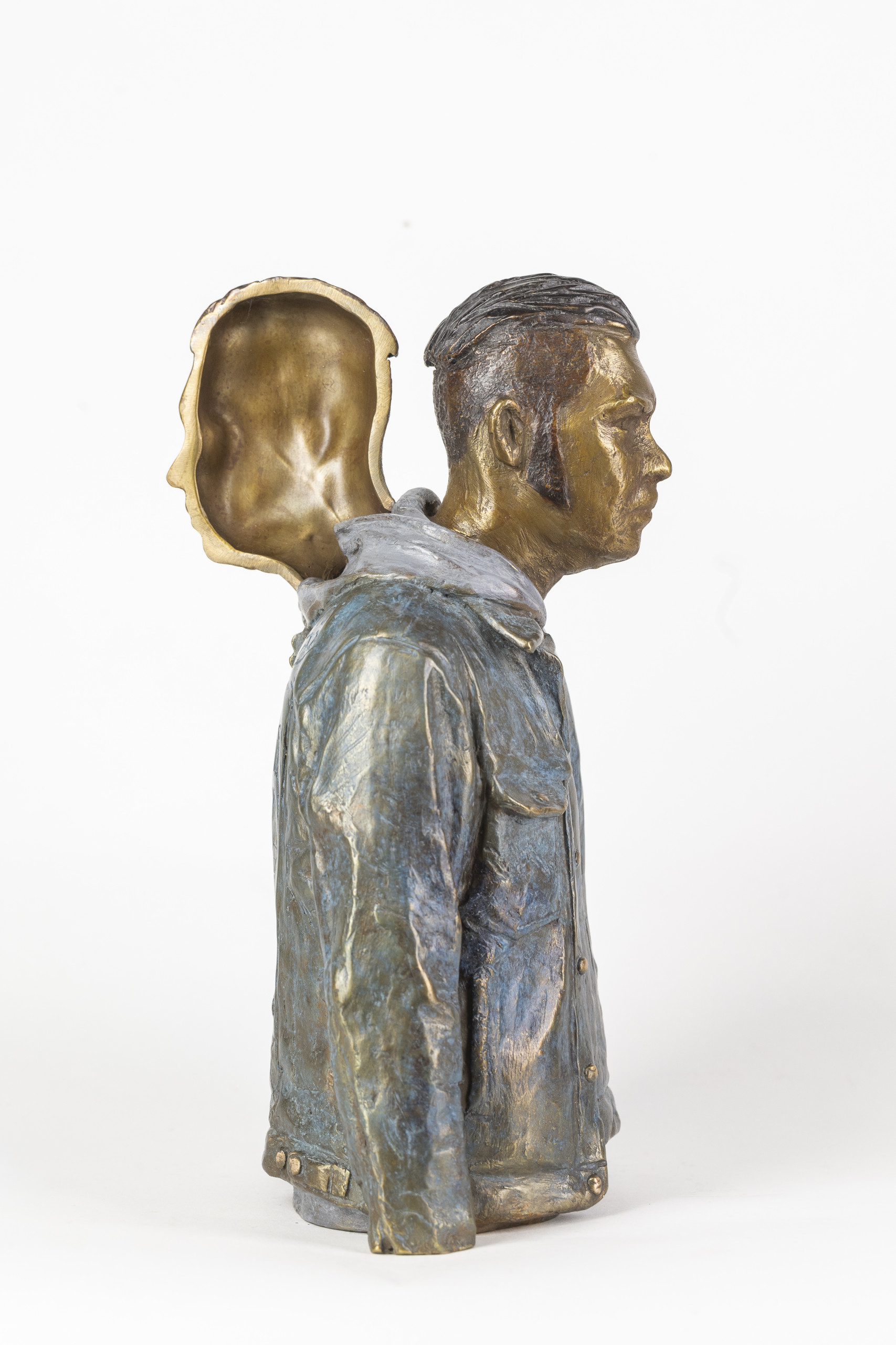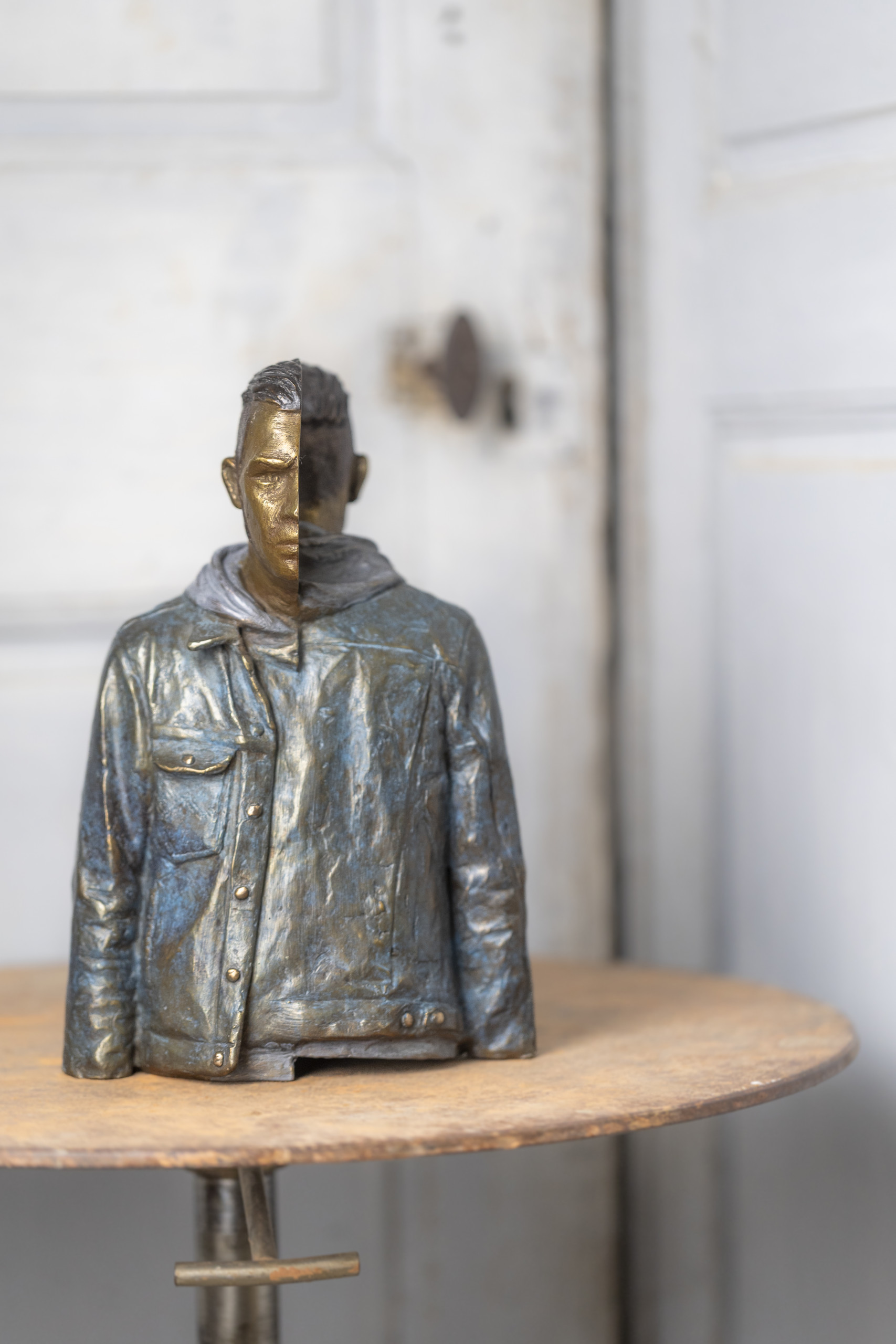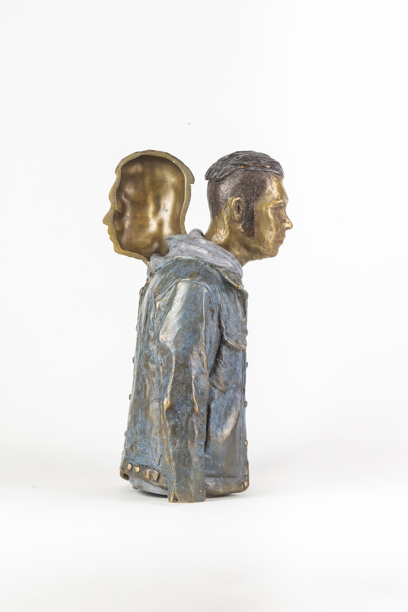 À double sens poursuit les thèmes de dualité et de symétrie que l’artiste développe depuis plusieurs années et qu’on retrouve dans une sculpture plus ancienne : Deux visages. Dans cette œuvre, Bruno Catalano affirme un geste cubiste, éclatant les points de vue et les perspectives. Les deux profils du personnage représenté se retrouvent dos à dos comme pour interroger des notions d’éclatement et d’équilibre.