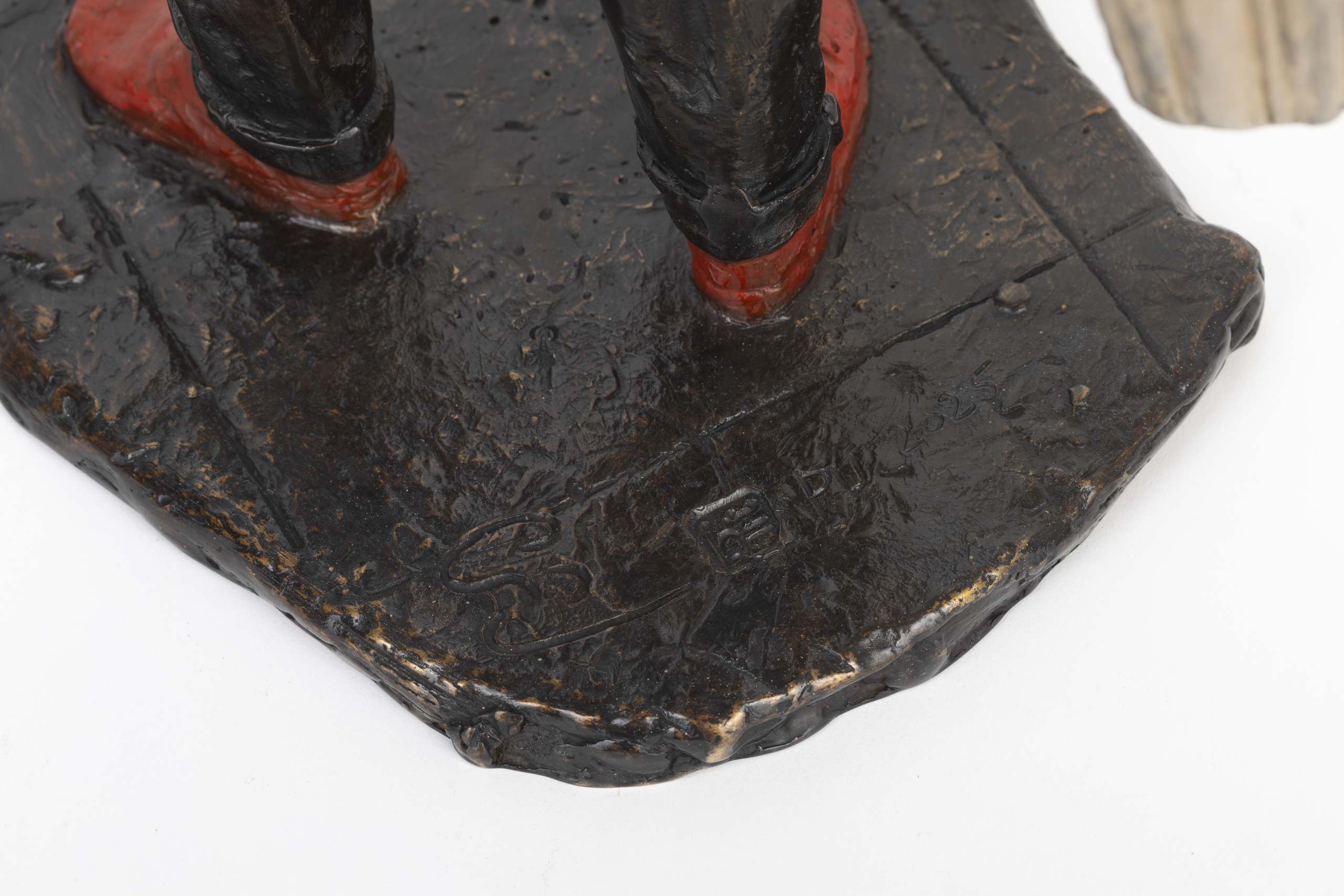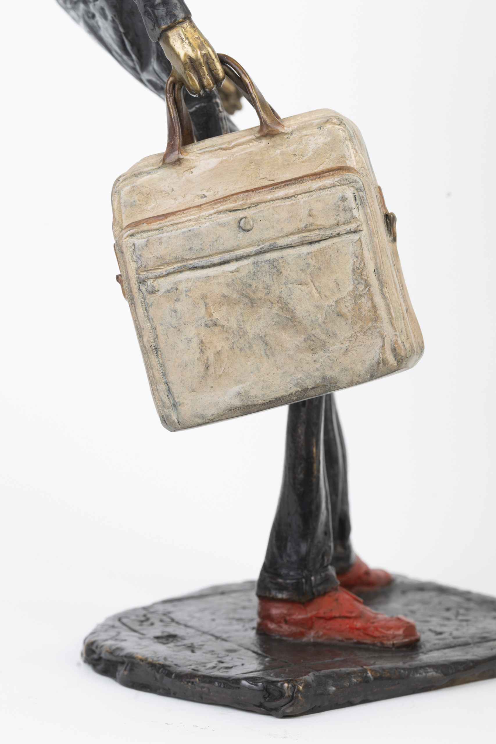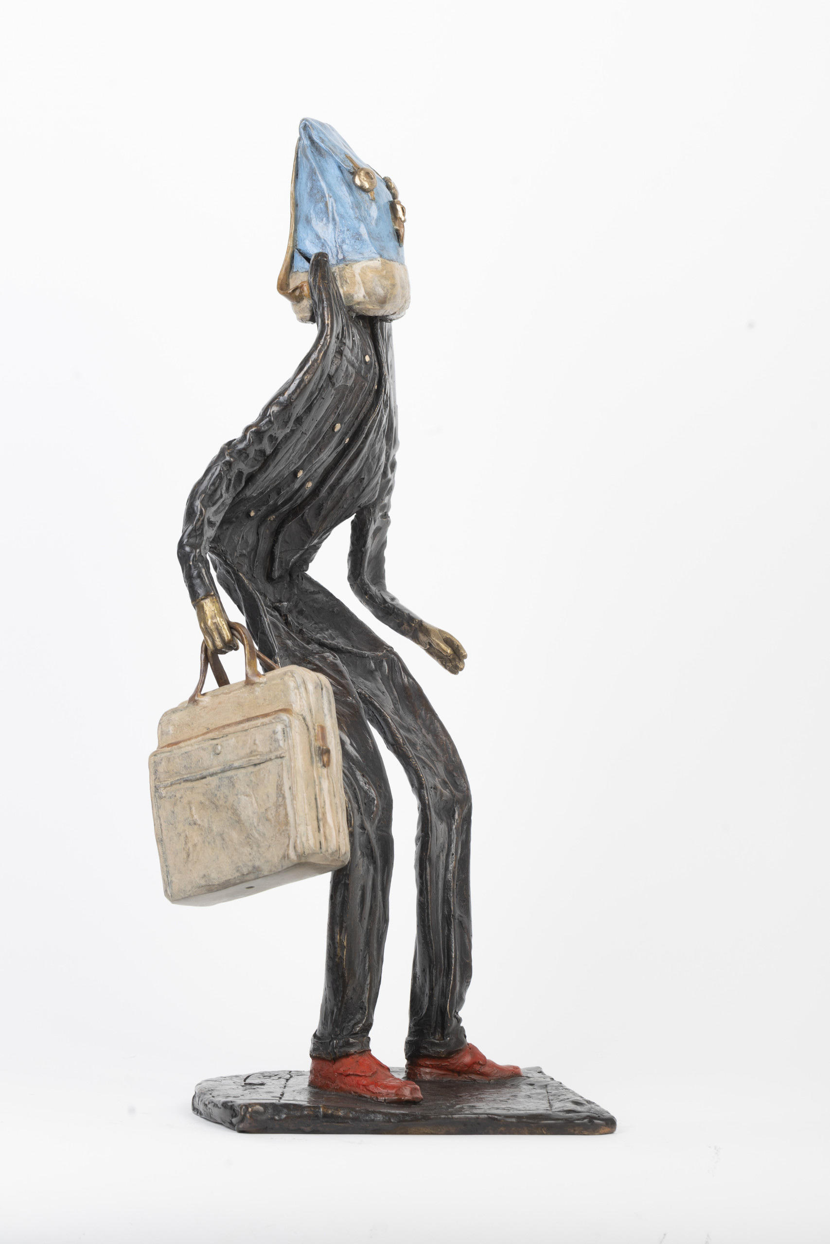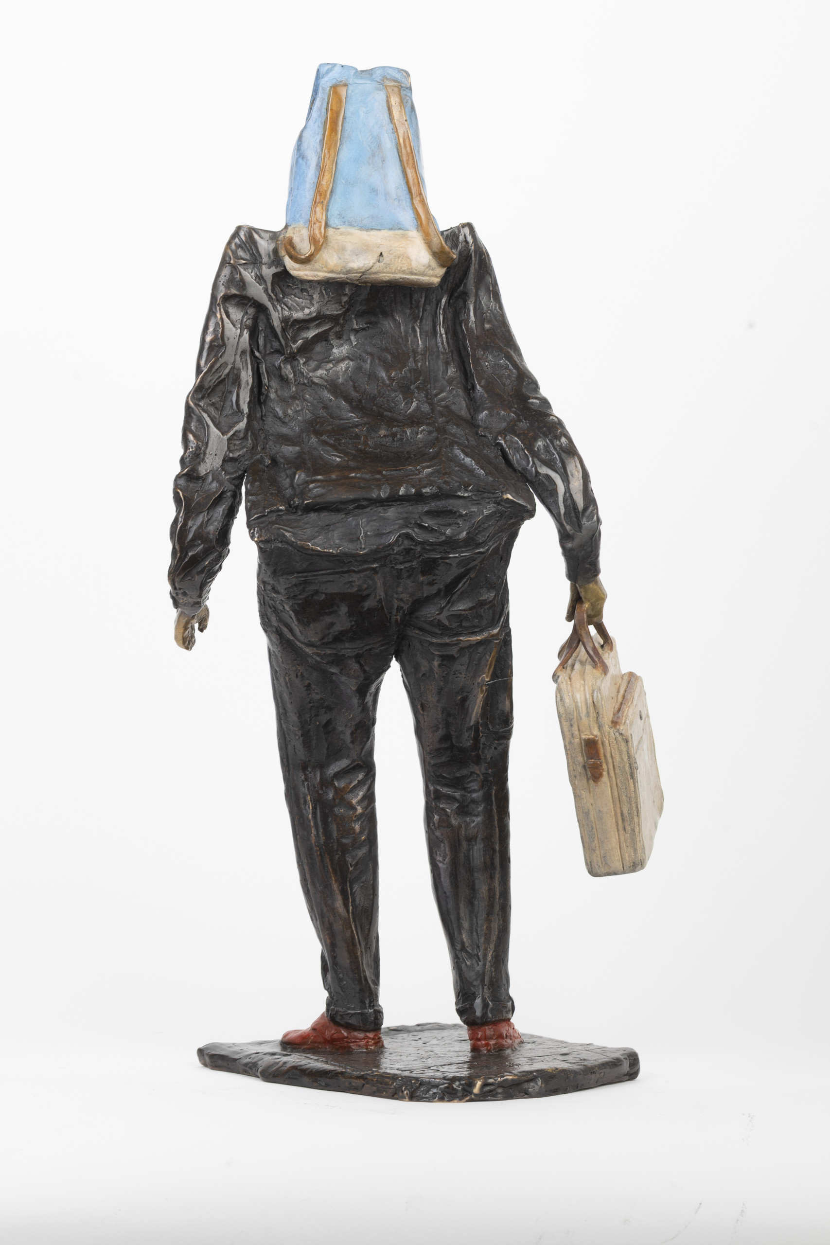 Laminoir est une sculpture d’un voyageur traité sur un mode burlesque. Le travail de Bruno Catalano est imprégné d’autodérision, de farce et de théâtralité. Le sculpteur joue ici avec les codes de la représentation, se joue de ses propres marqueurs stylistiques pour mieux les détourner : il remplace ainsi la tête du personnage par une valise, emblème de son travail. De plus, le personnage semble avoir été passé au laminoir, c’est-à-dire avoir vécu des temps difficiles. Derrière ce jeu, se cache des réalités et des problématiques plus profondes liées à la brutalité de l’existence.