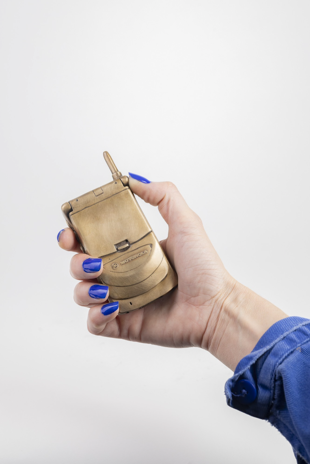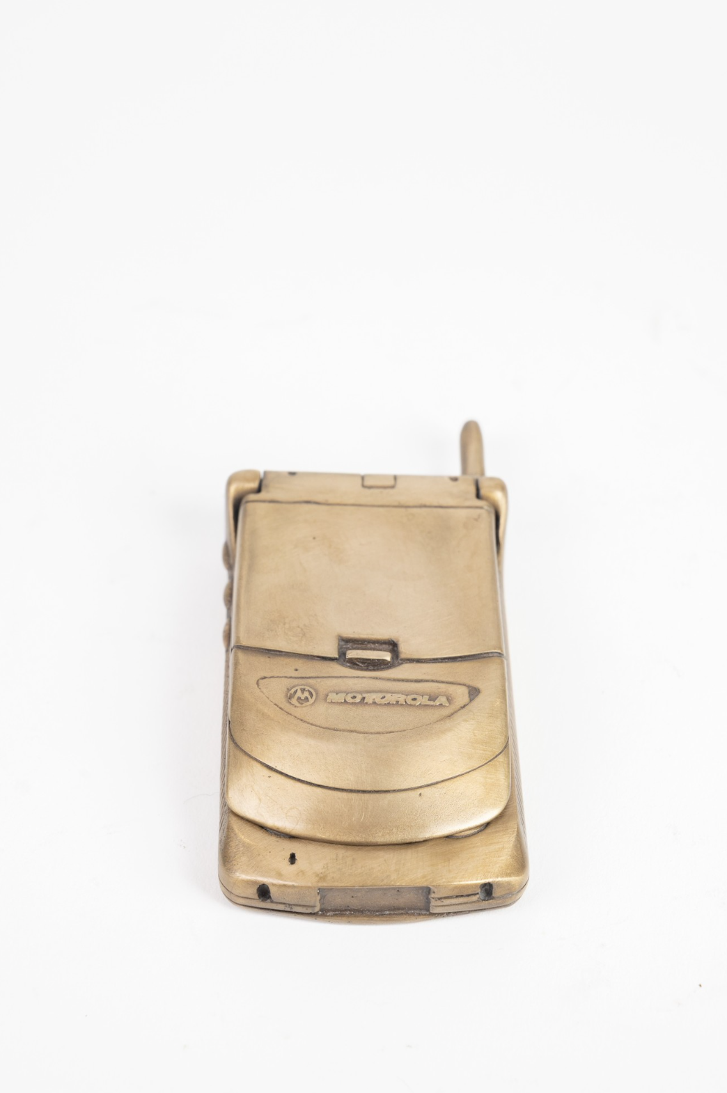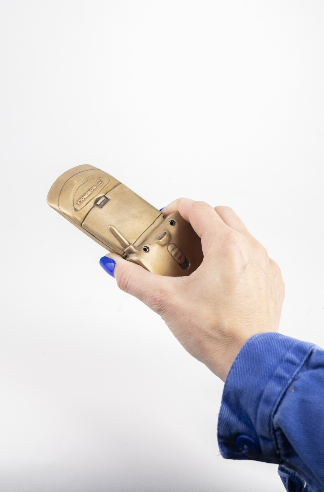 Bruno Catalano, intime connaisseur de son matériau de prédilection qu’est le bronze, a joué avec ses propriétés uniques pour créer ce Motorola. Il s’empare de cet objet de l’ordinaire, maintenant disparu ou oublié, pour suggérer le passé et figer le temps. Le téléphone est travaillé tout à la fois avec une exigence de vraisemblance et de réalisme et une volonté de susciter, par la patine, la tension entre le technologique et l’archaïque.
