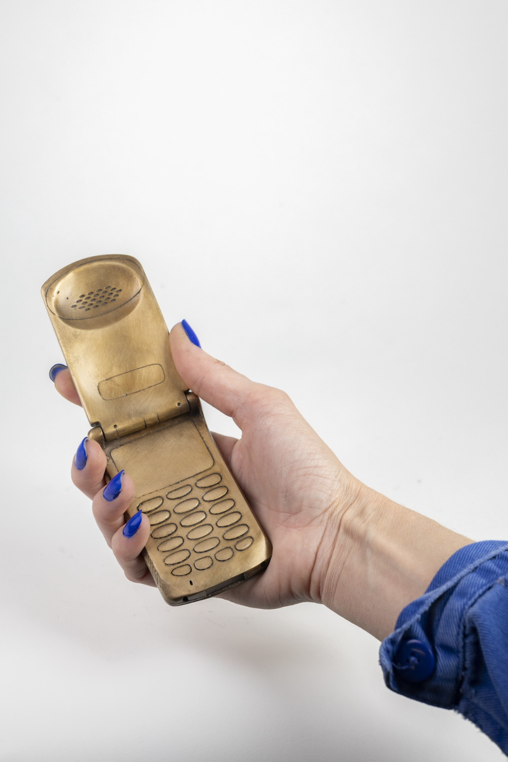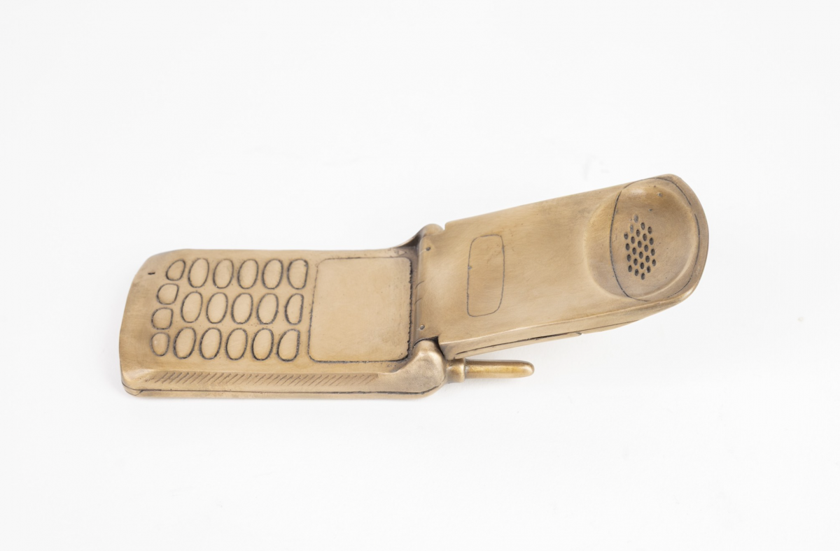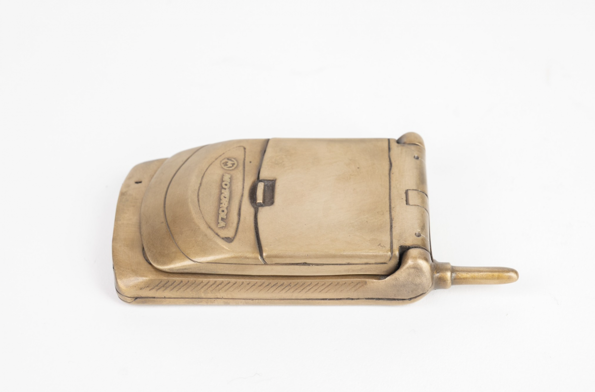 Bruno Catalano, intime connaisseur de son matériau de prédilection qu’est le bronze, a joué avec ses propriétés uniques pour créer ce Motorola. Il s’empare de cet objet de l’ordinaire, maintenant disparu ou oublié, pour suggérer le passé et figer le temps. Le téléphone est travaillé tout à la fois avec une exigence de vraisemblance et de réalisme et une volonté de susciter, par la patine, la tension entre le technologique et l’archaïque.